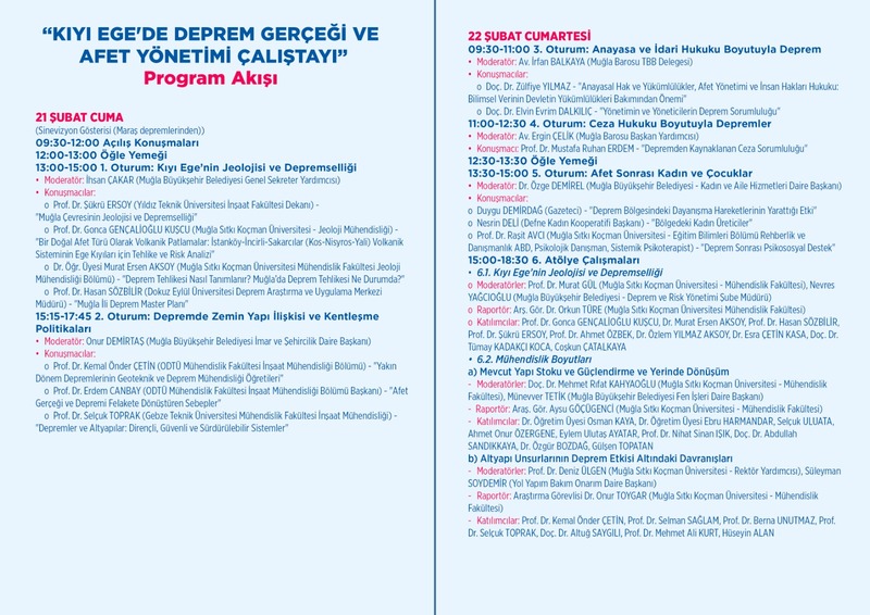 Kıyı Ege’de Deprem Gerçeği ve Afet Yönetimi Çalıştayı’na Yıldız Teknik Üniversitesi, Muğla Sıtkı Koçman Üniversitesi, Dokuz Eylül Üniversitesi, ODTÜ, Gebze Teknik Üniversitesi, Muğla Barosu, Kahramanmaraş Sütçü İmam Üniversitesi, Jeoloji Mühendisleri Odası, TMMOB İnşaat Mühendisleri Odası, Gazi Üniversitesi, Hacettepe Üniversitesi, Adnan Menderes Üniversitesi, Mersin Üniversitesi ve Pamukkale Üniversitesi’nden alanında uzman isimler katılacak.