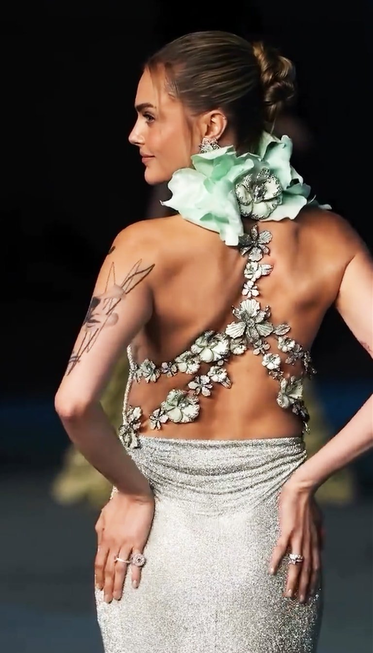 Oyuncu Cara Delevingne (33), gecede sırtı çiçeklerle süslü elbisesiyle dikkatleri çekti.