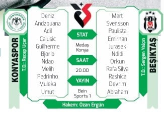 Teknik Direktör Sergen Yalçın ve futbolcular, Konya sınavına moralsiz hazır landı. Yalçın, kötü günlerin büyümesini engellemek için 3 puandan başka bir şey düşünmüyor. Öte yandan Beşiktaş, birçok yıldız futbolcusundan da yararlanamayacak. Ertelenen Konyaspor maçından sonra transfer edilen Cengiz Ünder, Djalo, Cerny, El Bilal Toure, Gökhan Sazdağı ve Jota kadroda olmayacak. Taylan Bulut ve genç sol kanat Devrim ise kadroda.