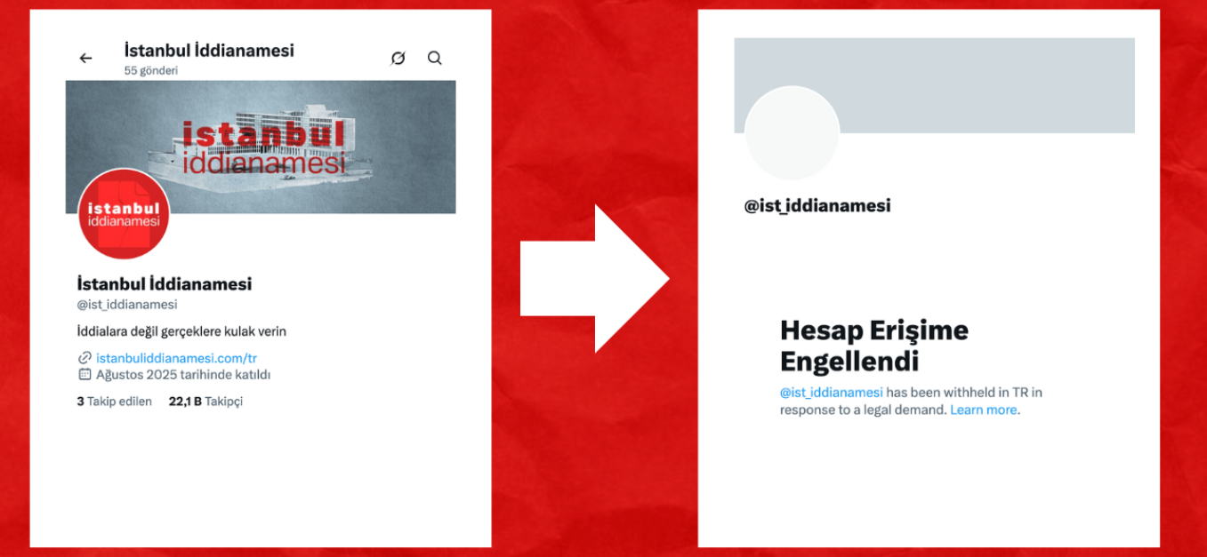 İfade Özgürlüğü Derneği kararı, "İstanbul Büyükşehir Belediyesi’ndeki (İBB) “yolsuzluk” iddialarıyla ilgili yürütülen soruşturma kapsamında İstanbul Cumhuriyet Başsavcılığı’nın hazırladığı iddianamenin ardından “İstanbul İddianamesi” adıyla açılan ve dosyada yer alan iddiaları ele alan (istanbuliddianamesi.com/tr) internet sitesi ve X hesabı (ist_iddianamesi), 5651 sayılı Kanunun 8/A maddesi uyarınca, millî güvenlik ve kamu düzeninin korunması gerekçesiyle erişime engellendi. Hesap, X tarafından Türkiye’den görünmez kılındı." diye duyurdu.