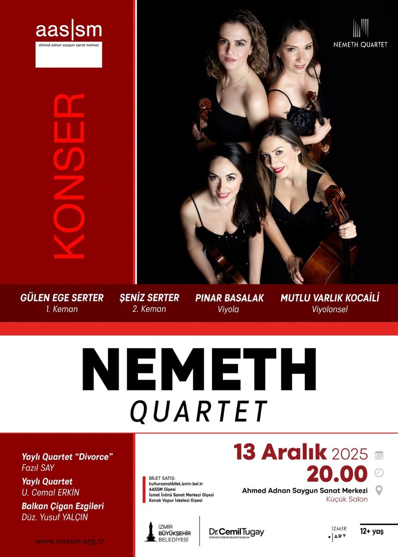Nemeth Quartet konseri, 13 Aralık’ta Küçük Salon’da saat 20.00’de düzenlenecek. 1995 yılında kurulan ve isimlerini aynı yıl trafik kazasında hayatlarını kaybeden hocaları Istvan Nemeth (keman) ve Katalin Nemeth’ten (çello) alan grup; Gülen Ege Serter (keman), Şenis Serter (keman), Pınar Basalak (viyola) ve Mutlu V. Kocaili’den (çello) oluşuyor. Konserin bilet satışı kultursanatbilet.izmir.bel.tr adresi üzerinden yapılıyor.