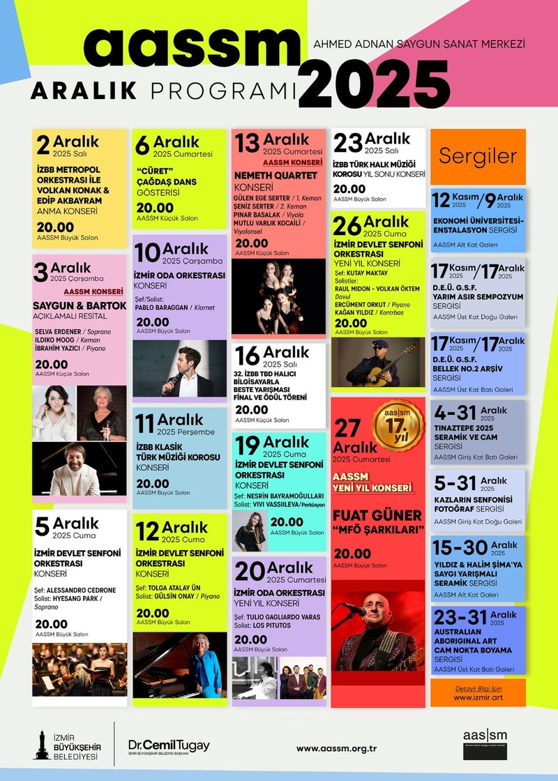 İzmir Büyükşehir Belediyesi Ahmed Adnan Saygun Sanat Merkezi (AASSM), aralık ayında dopdolu bir programla 2025’i uğurluyor. Klasik müzikten çağdaş dansa, fotoğraf sergilerinden yılbaşı konserleri ve AASSM’nin 17. yılı kutlamalarına uzanan geniş yelpazedeki etkinlikler, aralık ayının her gününü sanatla buluşturuyor.