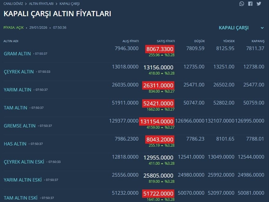Küresel piyasalarda jeopolitik risklerin etkisi ile ekonomik belirsizliklerin artmasına ek olarak Fed'in faiz kararı altın fiyatlarını uçurdu. ABD dolarındaki değer kaybından destek bulan ons altın 5 bin 598 dolara yükseldi. Gram altın ise Kapalıçarşı'da 8 bin lirayı aşarak tüm zamanların rekorunu kırdı.