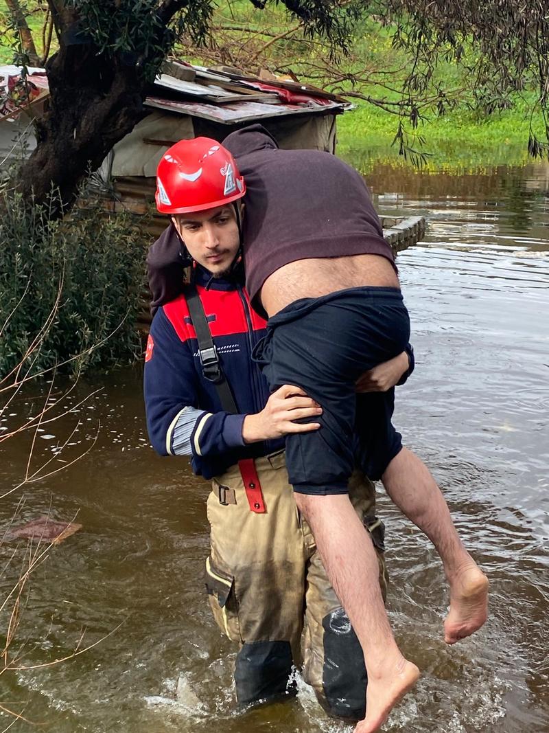 İzmir’de etkili olan şiddetli yağış sırasında boş arazideki barakaya sığınan bir kişi suların yükselmesiyle birlikte bulunduğu yerde mahsur kalınca itfaiye ekiplerine haber verildi. Olay yerine gelen İzmir İtfaiyesi’nde görevli Alper Aksular zor durumdaki vatandaşı çevresi suyla kaplı barakadan sırtında taşıyarak çıkardı.