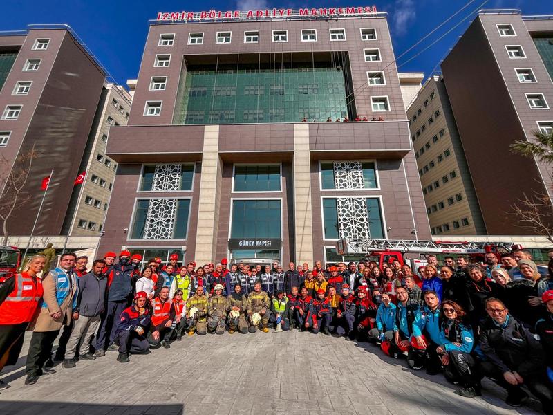 İzmir Bölge Adliye Mahkemesi’nde gerçekleştirilen geniş kapsamlı tatbikatta, şüpheli paketler etkisiz hale getirildi, mahsur kalan personel itfaiye ekipleri tarafından güvenle kurtarıldı. Tatbikata İzmir Büyükşehir Belediyesi İtfaiyesi, AFAD, UMKE ve emniyet birimleri katıldı.