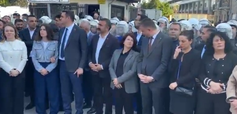 Gerginliğin sürdüğü bina önünde CHP'li Belediye Başkanları protesto eylemi gerçekleştirdi. CHP'li Belediye Başkanları alkış tutarak hep birlikte İzmir Marşı'nı söylediler.
