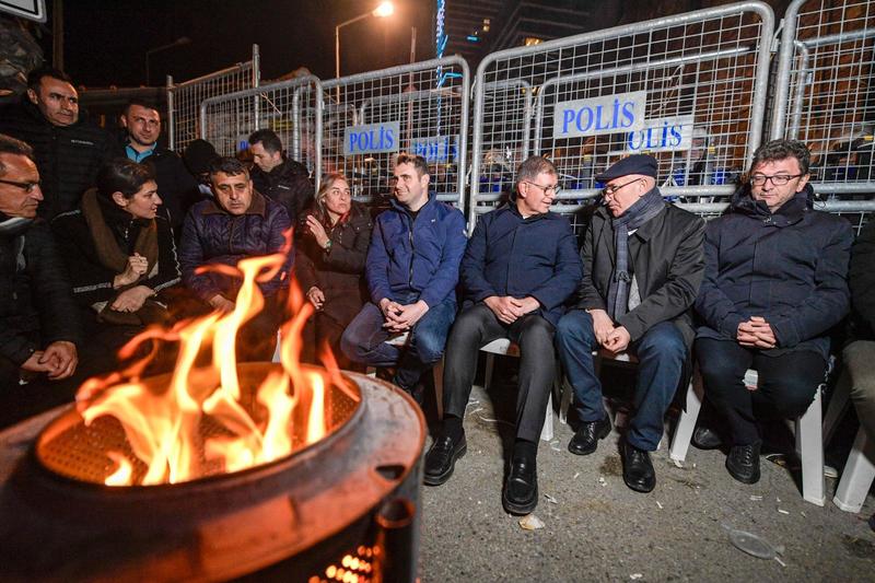 İzmir Büyükşehir Belediyesi’ne ait Meslek Fabrikası’na yönelik el koyma girişimine karşı başlatılan nöbet, perşembe gecesi de sürdü. Başkan Dr. Cemil Tugay öncülüğünde bir araya gelen yurttaşlar, türkülerle dayanışmayı büyüttü. CHP Şanlıurfa Milletvekili Mahmut Tanal da mücadeleye katıldı. Tanal, pense ile binayı çevreleyen polis barikatlarını birbirine bağlayan plastik kelepçeleri kesti.