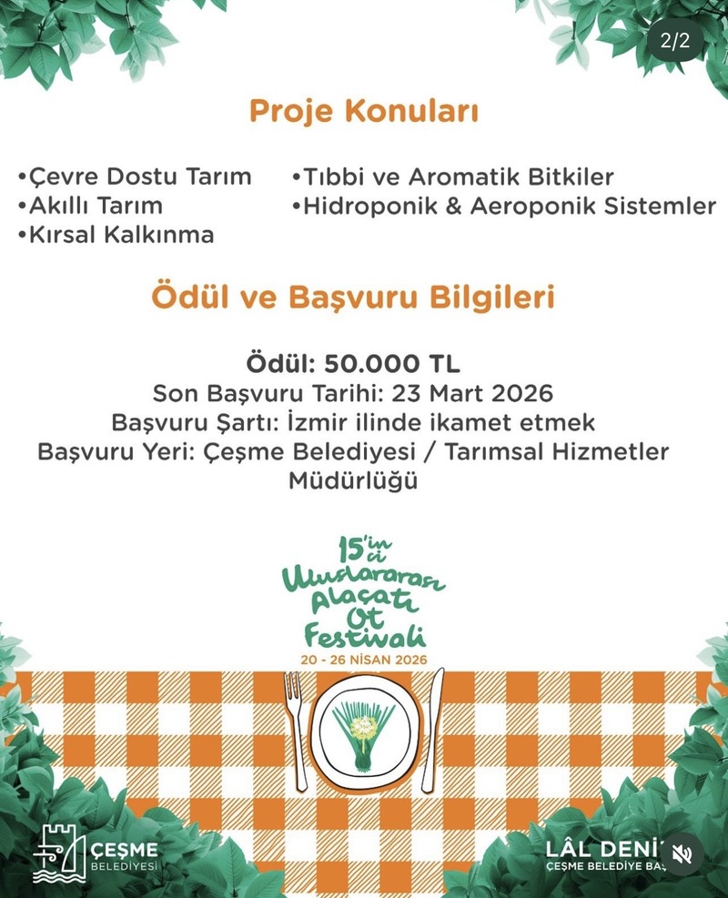 Değerlendirme süreci sonunda dereceye giren projeler, 25 Nisan’da 15. Uluslararası Alaçatı Ot Festivali kapsamında düzenlenecek törenle kamuoyuna açıklanacak ve ödüller sahiplerini bulacak.