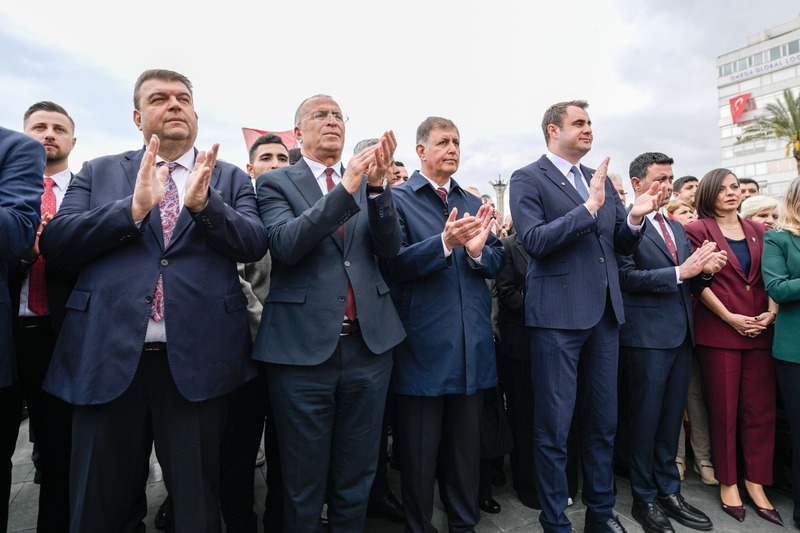 İzmir Büyükşehir Belediye Başkanı Dr. Cemil Tugay, Cumhuriyet Halk Partisi (CHP) İzmir İl Başkanlığı tarafından Cumhuriyet Meydanı’nda düzenlenen 23 Nisan Ulusal Egemenlik ve Çocuk Bayramı çelenk sunma törenine katıldı. Törende CHP İzmir İl Başkanı Çağatay Güç’ün yanı sıra ilçe örgütü başkanları, belediye başkanları, parti yöneticileri ve üyeler de yer aldı. Meydandaki Atatürk Anıtı’na çelenk; Çağatay Güç, CHP İzmir Kadınlar Kolları Başkanı Zahide Kurun ve CHP İzmir Gençlik Kolları Başkanı Ruhsar Selis Çelik Kınacı tarafından sunuldu. Saygı duruşu ve İstiklal Marşı’nın ardından, Kahramanmaraş’ta meydana gelen okul saldırısında hayatını kaybedenler için sessiz yürüyüş düzenlendi. Başkan Tugay’ın da katıldığı yürüyüşte, “Vatanı korumak, çocukları korumakla başlar” yazılı pankart taşıyan partililer İzmir İl Milli Eğitim Müdürlüğü’ne kadar yürüdü.