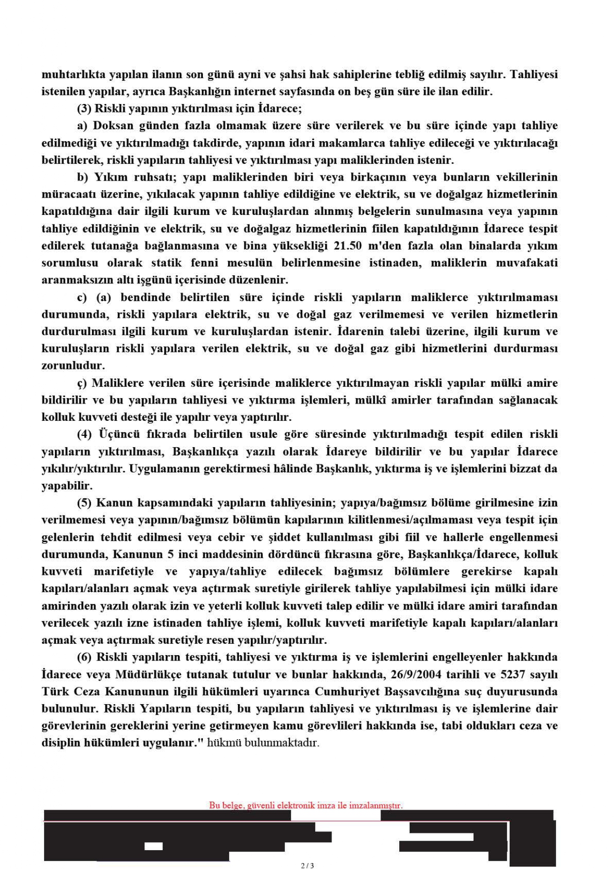 6306 Sayılı Kanun ve uygulama yönetmeliği kapsamında riskli yapı kararı kesinleştikten sonra maliklerce yapının yıkımı yerine güçlendirilmesi yönünde karar alınsa dahi gerek can ve mal güvenliği yönünden gerekse de yasal olarak yapının tahliye edilmesinin zorunluluğu tartışmasızdır. Ayrıca riskli yapının tapu kaydında yer alan “riskli yapı şerhi” yapı yıkıldıktan veya güçlendirildikten sonra kaldırılmaktadır. Bu doğrultuda yapının güçlendirilip ruhsat işlemleri tamamlandıktan ve tapudaki şerhin terkininden sonra kullanıma açılacağı da 6306 sayılı kanunda hüküm altına alınmıştır.