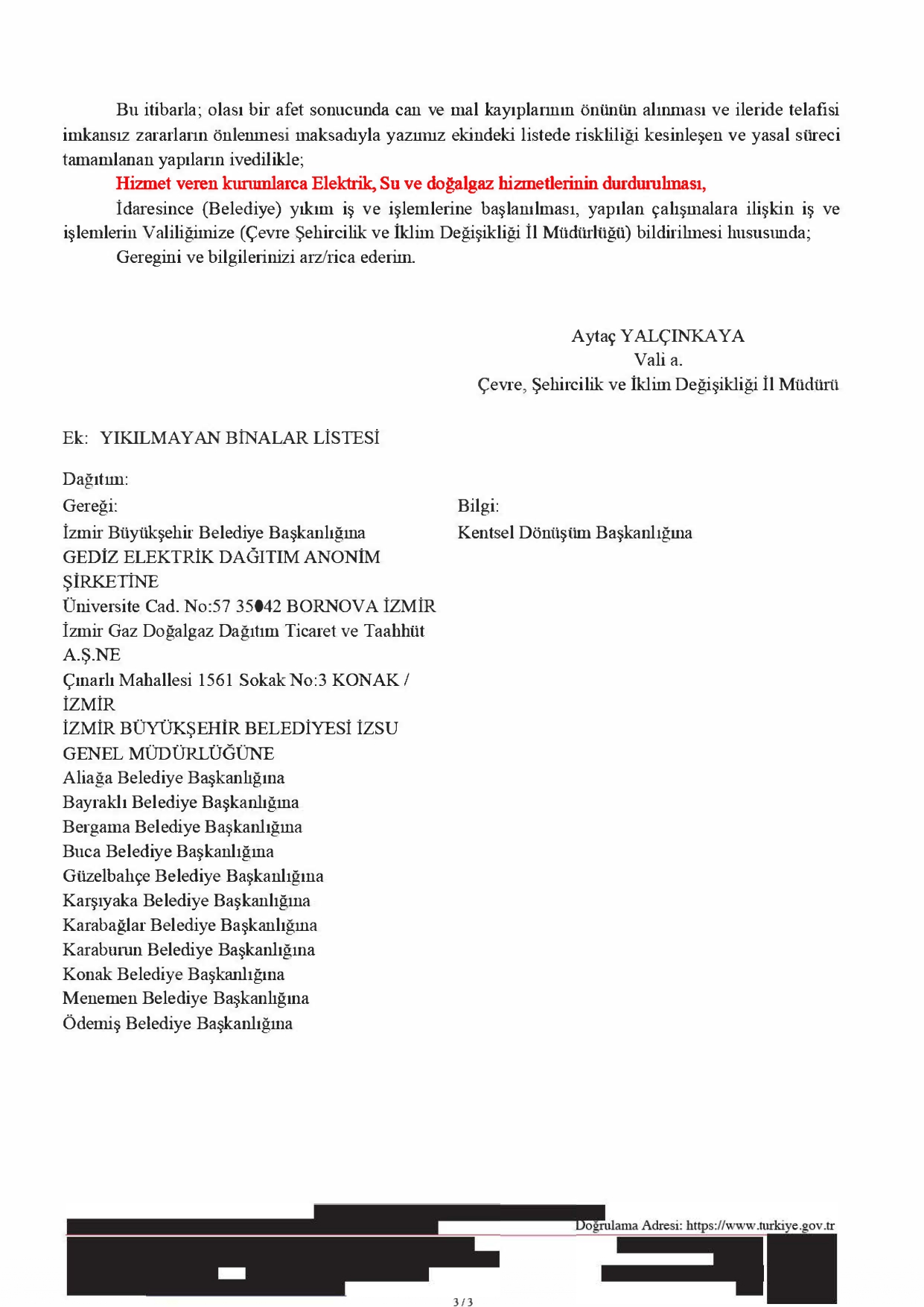 Sonraki aşamada ise Çevre, Şehircilik ve İklim Değişikliği İzmir İl Müdürlüğü’nün 29.07.2025 tarihli yazısı ile söz konusu taşınmazın ilgili kurumlarca elektrik, su ve doğal gaz hizmetlerinin durdurulması ve yıkım işlemlerine başlanılması gerektiği bildirilmiştir. Bu kapsamda GDZ Elektrik Dağıtım AŞ tarafından yapıya bağlantı hattının 08.09.2025 tarihinde iptal edileceği duyurusu asılmıştır.